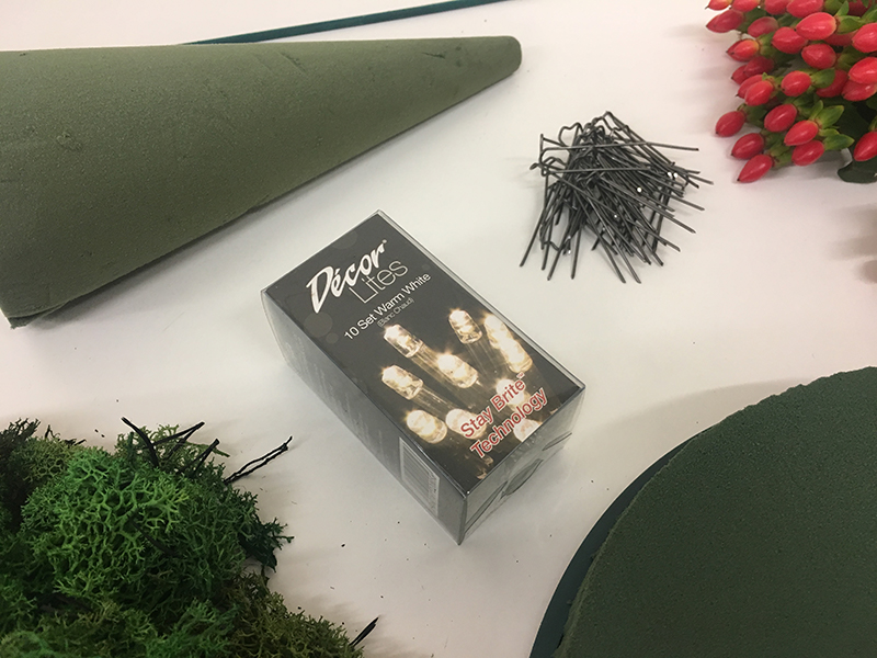 - Attach the set of decor lites to the floral foam cone with the mossing pegs – start at the top and work your way down the cone.