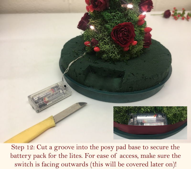 - Create a groove in the posy pad to store the battery pack for the decor lites. Make sure the switch is positioned facing outwards for ease of access later on (this will be covered up with a christmas bow at the end)!