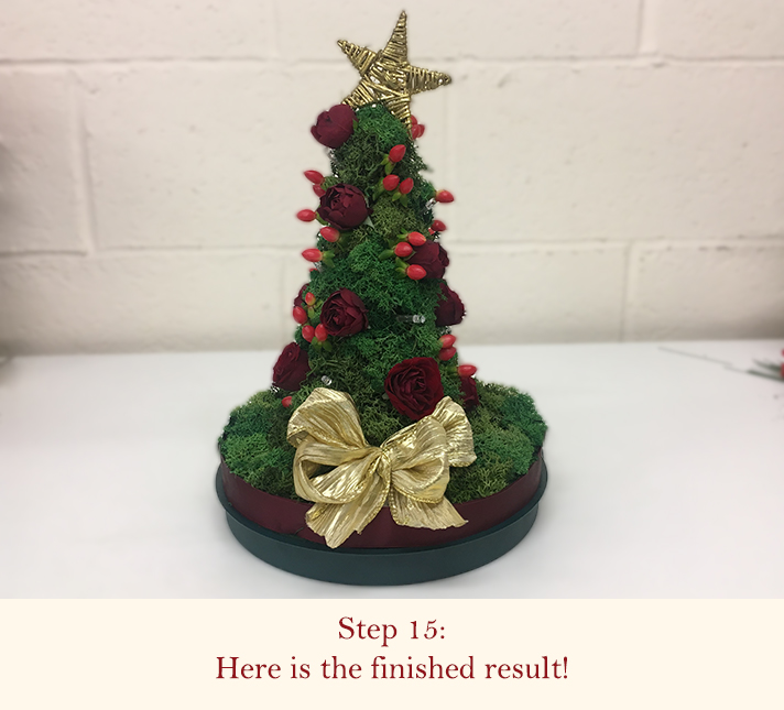 - For the base of the christmas tree, you can cover with preserved moss, blue spruce, oak leaves etc. Repeat the process with the floristry green wire or mossing pegs to secure.