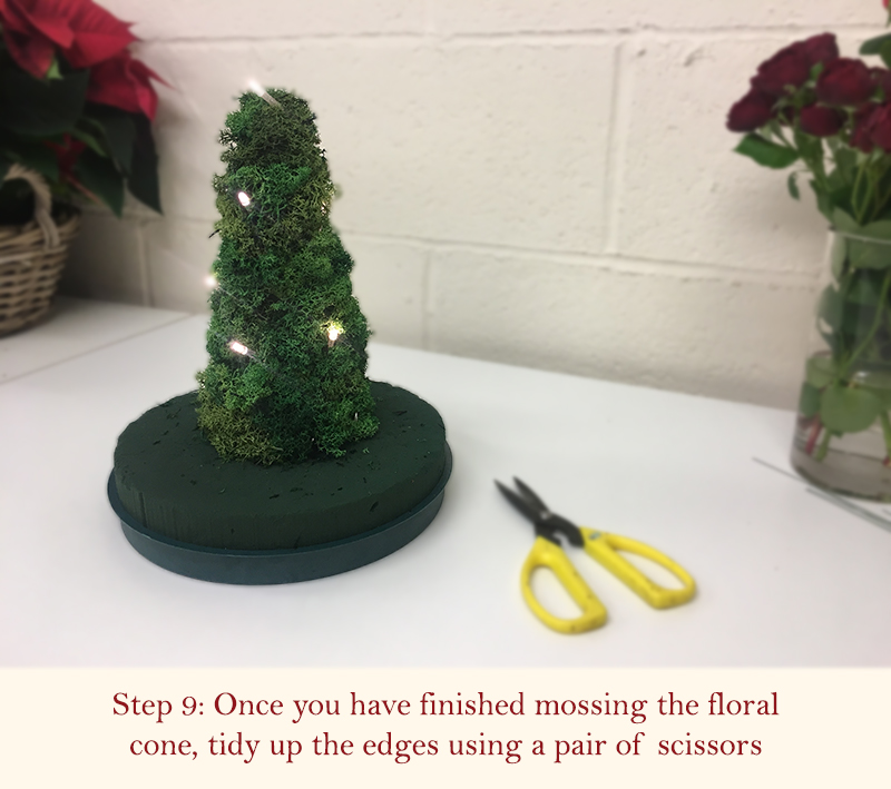 - Once you have finished mossing the body of the floral cone, you can tidy and neaten the appearance of the tree using a pair of scissors