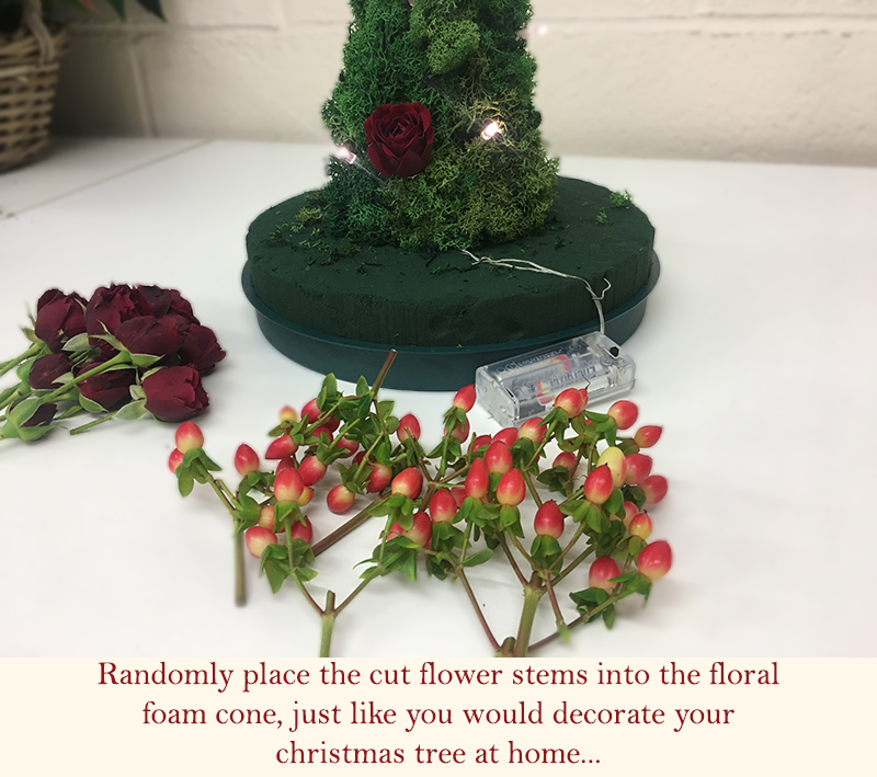 - Randomly place the cut flowers, hypericum and spray roses, into the floral foam cone, just like you would if you were decorating your christmas tree at home