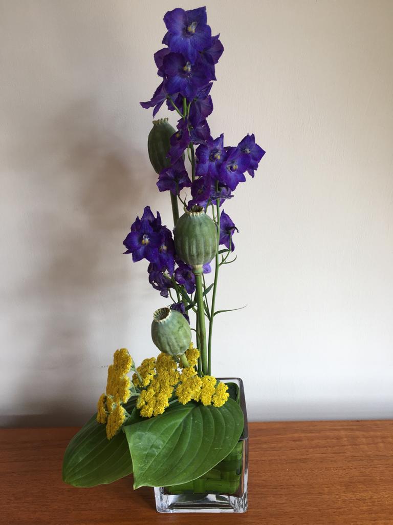 First place the Delphiniums in a grouped staggered line. Followed by the Hosta leaves, grouped to one side of the design. Then add the Poppy seed heads. Followed by the achillea and Lily Grass